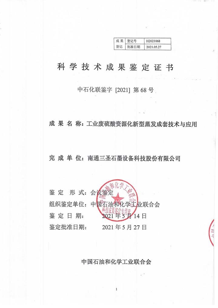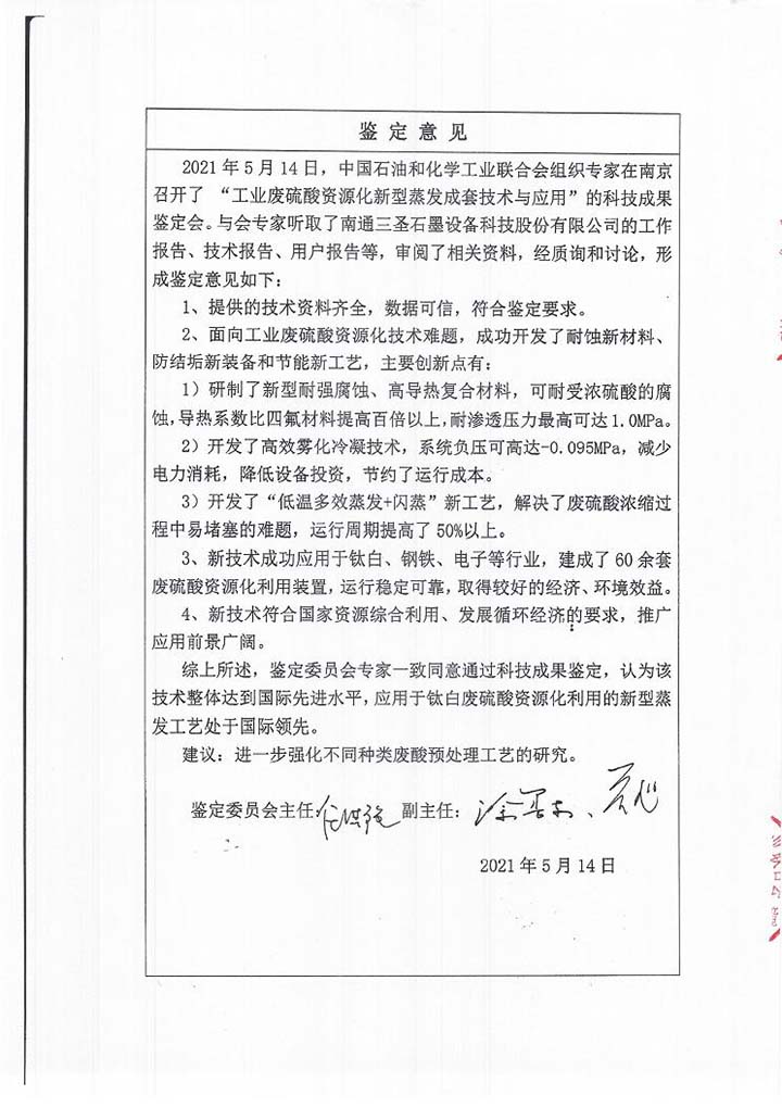 2021年5月27日,中國石油和化學工業聯合會批準了南通三圣石墨設備科技股份有限公司“工業廢硫酸資源化新型蒸發成套技術與應用”的科技成果鑒定,由南京大學任洪強院士擔任主任,華東理工大學涂善東院士、南京工業大學喬旭校長擔任副主任的鑒定委員會專家一致認為,該技術整體達到國際先進水平,應用于鈦白廢硫酸資源化利用的新型蒸發工藝處于國際領先。