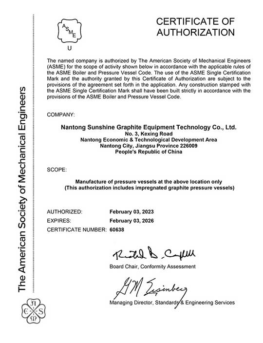 獲得ASME “U”鋼印認證標志著南通三圣在石墨設備制造方面的實力得到了國際權威的認可。這不僅體現了公司在研發、生產和質量控制方面的優秀表現,也是對公司持續創新和環保理念的有力證明。